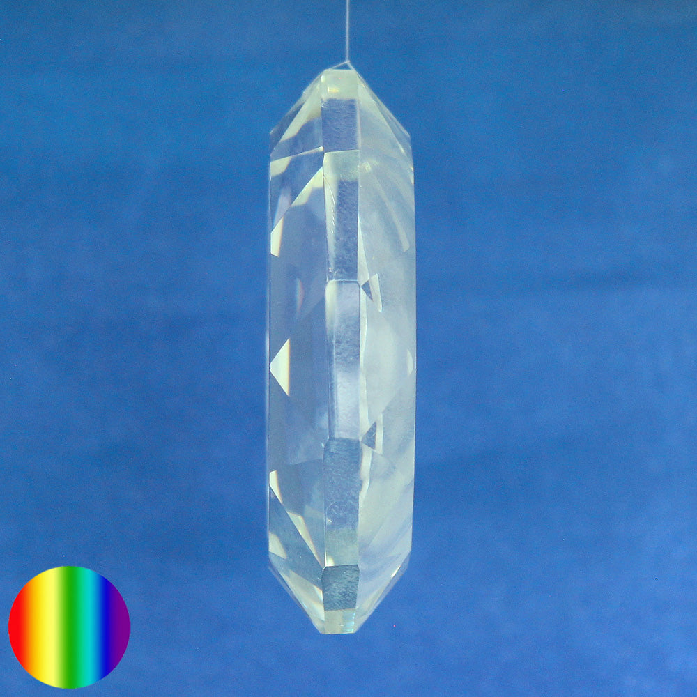 Der massive Glas Kristall mit einen Mond der in negativer Form graviert und satiniert ist, hat ein Loch zum Aufhängen an einem Faden. Die Kanten sind facettiert geschliffen.